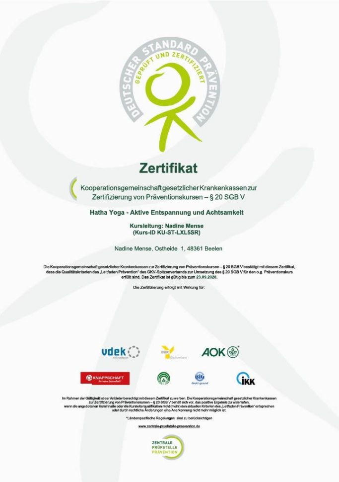 Die Kurse enden nach den festgelegten Terminen automatisch. Präventionskurse können nach § 20 bei der Krankenkasse eingereicht werden. Sie werden bis zu 100% * erstattet. Bitte informiere dich bei deiner Krankenkasse, da du selbst den Kurs nach Teilnahme einreichen musst. Achte auf die Kennzeichnung des Kurses, denn nur diese Kurse sind bei der Zentralen Prüfstelle Prävention zertifiziert!